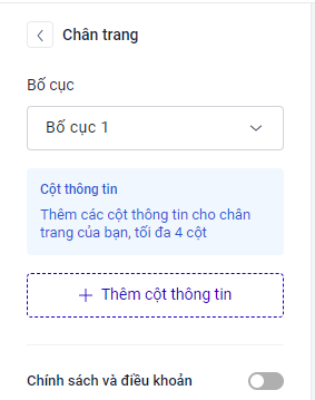 1. Bố cục : cho phép chọn 2 loại bố cục chân trang , bố cục 1 - bố cục giao diện lần lượt theo hàng ngang cột 1 rồi đến cột 2. Bố cục 2- bố cục giao diện lần lượt theo hàng dọc cột 1 rồi đến cột 2.&#x20;