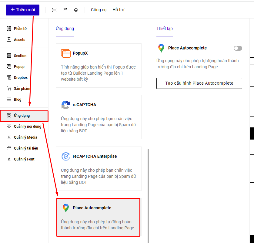 **Cách 2  : Bạn vào phần Thêm mới -> Ứng dụng --> Place Autocomplete**