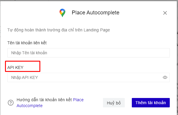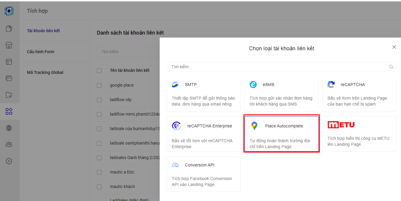 **Cách 1**   Truy cập trang [builder.ladipage.com](http://builder.ladipage.com/), chọn menu **Tích hợp -> Tài khoản liên kết -> Tạo tài khoản liên kết.** Sau đó lựa chọn Loại tài khoản là  **Place Autocomplete**