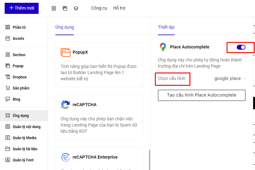 Tại mục Ứng dụng --> Place Autocomplete, bạn bật sử dụng ứng dụng và chọn cấu hình Place autocomplete mới tạo