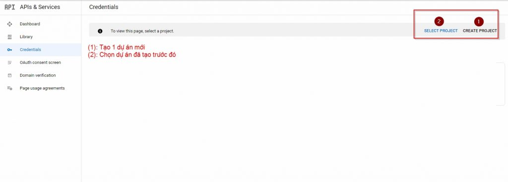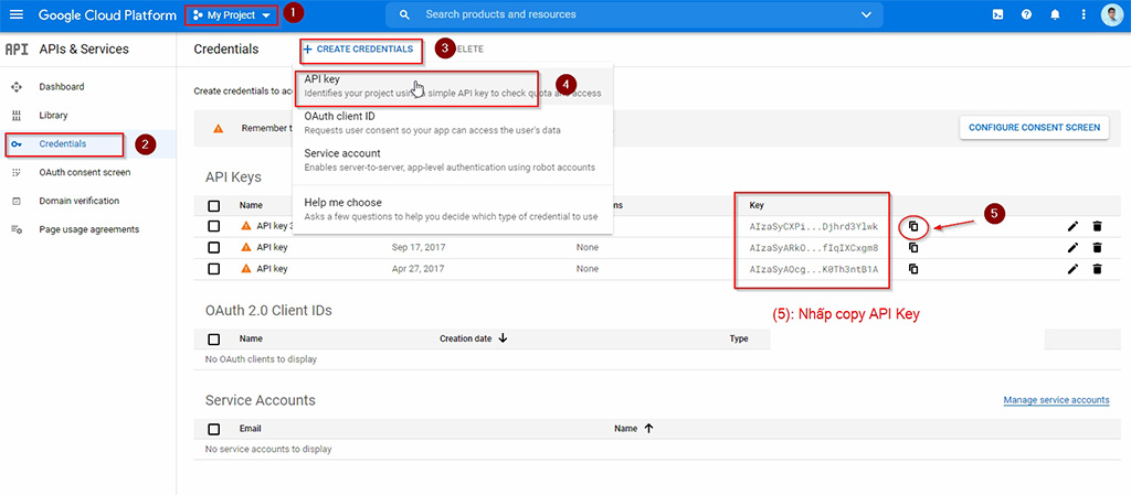 * Nhấn tạo 1 API Key: Sau khi tạo xong 1 project mới bạn hãy chọn dự án mới tạo. vd: mình đã tạo dự án **“My Project”**