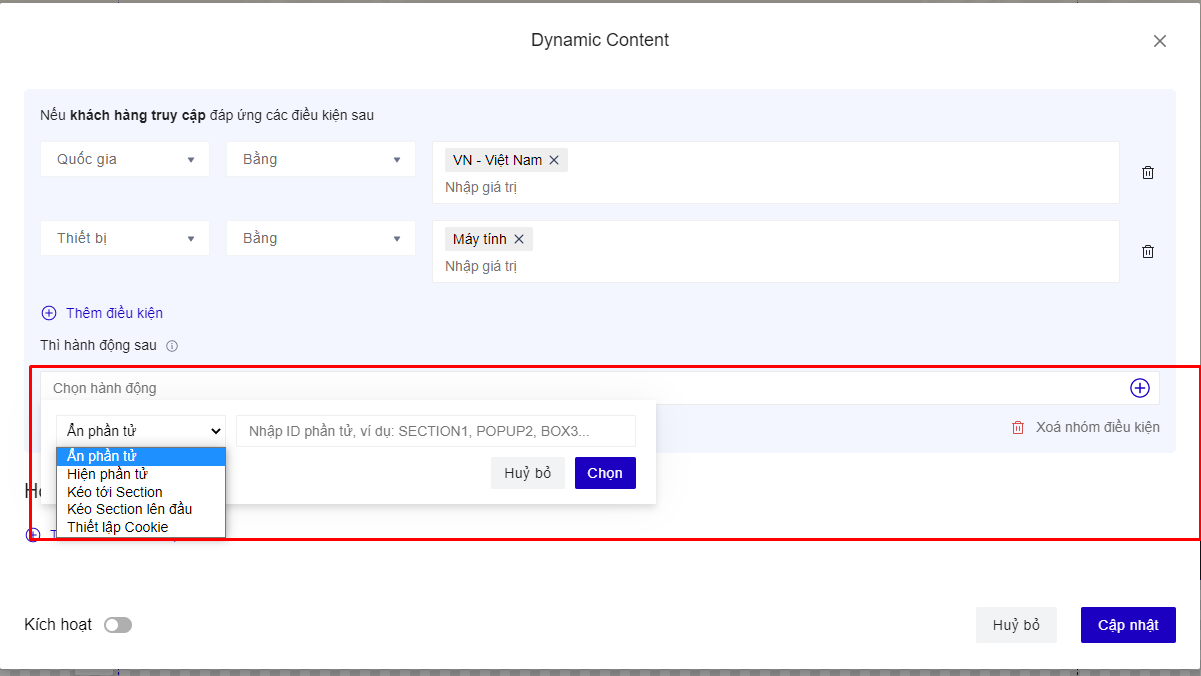2. **Hành động  :** Khi khách hàng đáp ứng điều kiện thì thực hiện các hành động trên trang landingpage của bạn . Bạn có thể thiết lập nhiều điều kiện hành động cùng 1 lúc bằng cách chọn lần lượt các hành động&#x20;