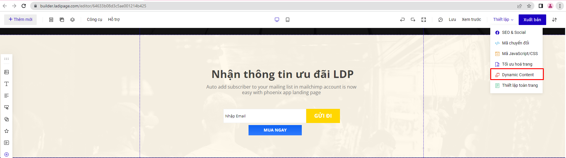 **Truy cập builder chỉnh sửa của landingpage -> Thiết lập -> Dynamic Content**