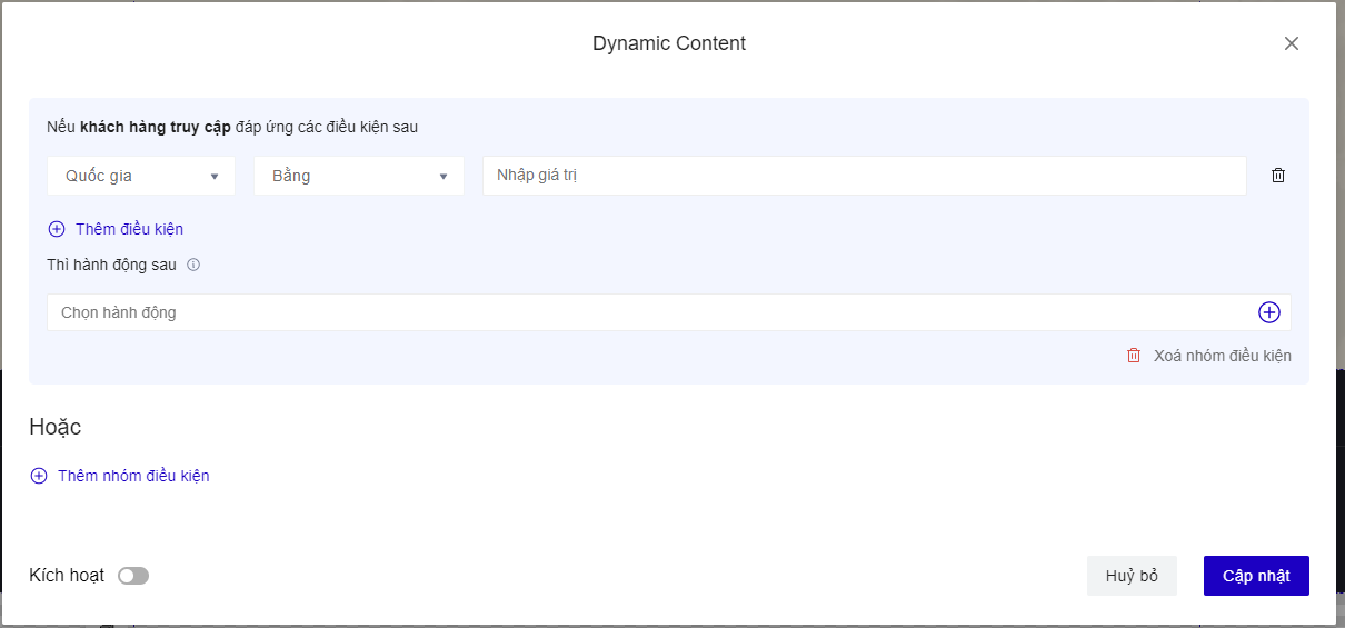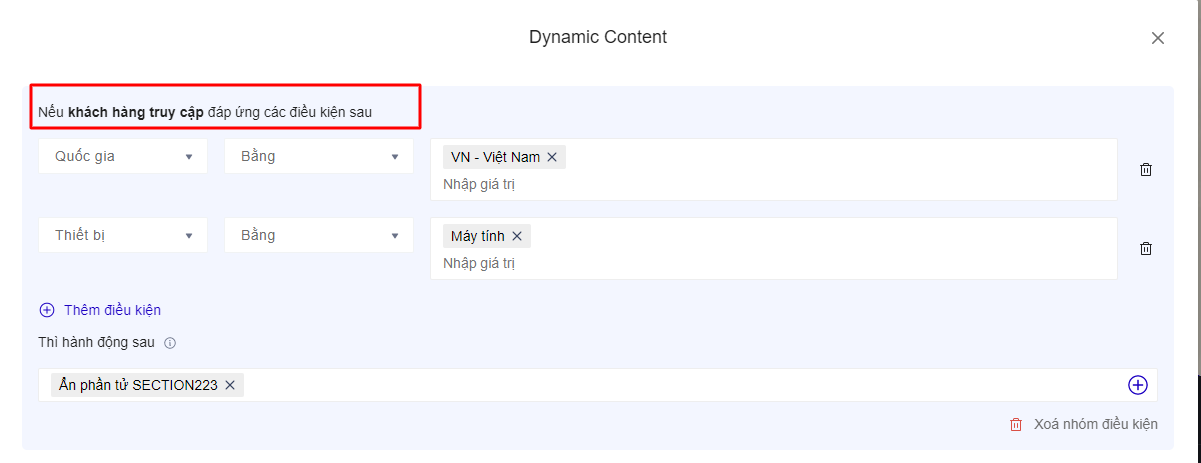 1. **Điều kiện hiển thị** :  khách hàng vào trang đáp ứng điều kiện và kích hoạt được phần dynamic content  . Thứ tự hoạt động các điều kiện sẽ theo thứ tự từ trên xuống dưới, khách hàng phải đáp ứng tất cả các điều kiện thì dynamic content mới hoạt động&#x20;