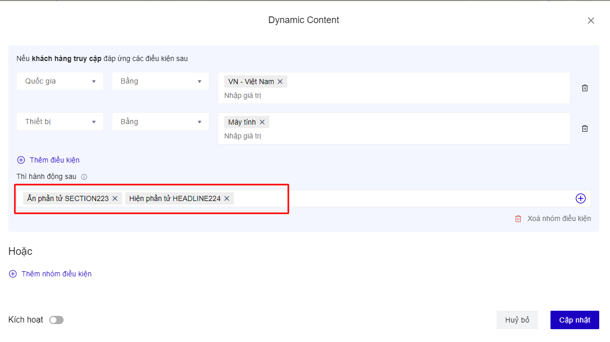 <figure><img src="https://content.gitbook.com/content/Pt4qBo6SG7lFxhw0I4Zm/blobs/qIRHvlsuSLhTSQ2Mkk2A/image.png" alt=""><figcaption><p>Ví dụ về phần điều kiện : khách hàng ở việt nam và truy cập link trang bằng Thiết bị máy tính</p></figcaption></figure>