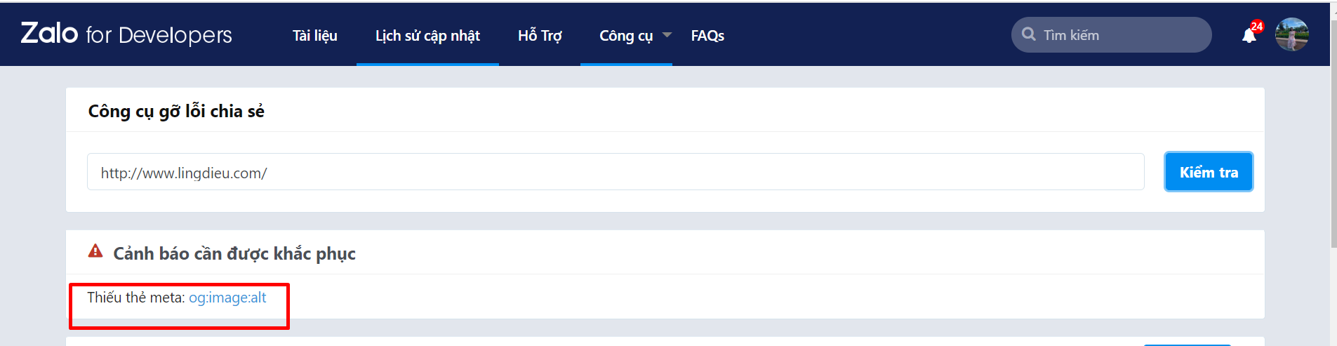 * Phần gợi ý thiếu thẻ alt của ảnh chia sẻ không ảnh hưởng tới hoạt động và hiển thị của trang landing page khi khách hàng truy cập hoặc chia sẻ.