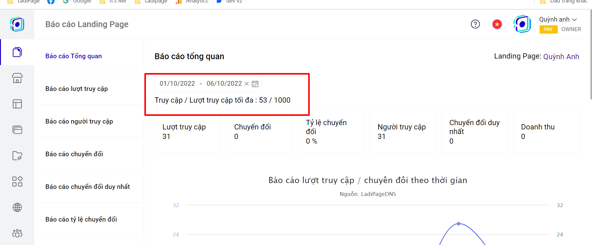 Báo cáo của trang landing page xuất bản với tên miền miễn phí: Tất cả các trang landing page xuất bản với tên miền miễn phí không hỗ trợ báo cáo chi tiết (Người truy cập, chuyển đổi, chuyển đổi duy nhất, tỷ lệ chuyển đổi và doanh thu), sẽ chỉ có phần tính lượt truy cập/tháng.