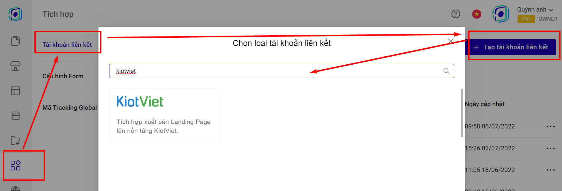 Truy cập trang [builder.ladipage.com](http://builder.ladipage.com/), chọn menu **Tích hợp -> Tài khoản liên kết -> Tạo tài khoản liên kết.** Sau đó lựa chọn Loại tài khoản là KiotViet.