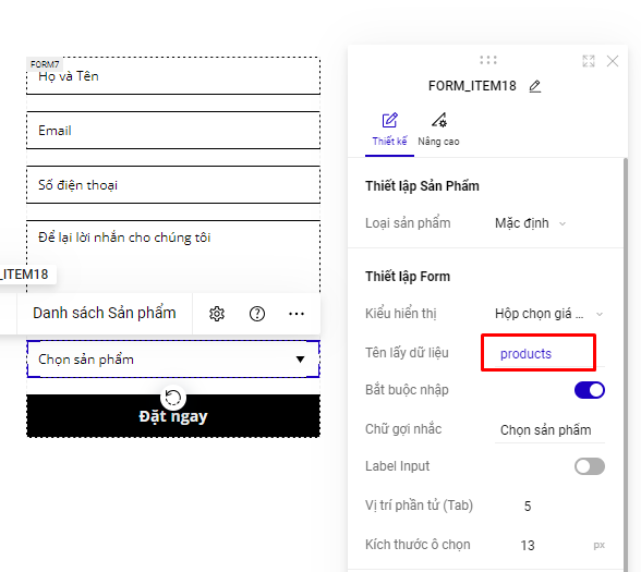 Bạn tìm kiếm sản phẩm từ mục Sản phẩm và chọn danh sách các sản phẩm muốn hiển thị trên form