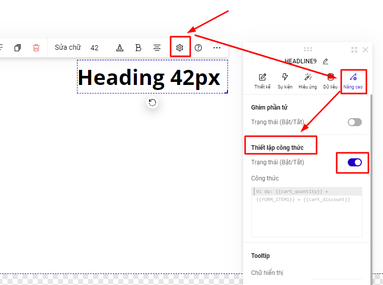 Bạn truy cập mục Thiết lập của phần tử -> Nâng Cao -> Thiết lập công thức, chọn trạng thái là Bật để kích hoạt sử dụng&#x20;