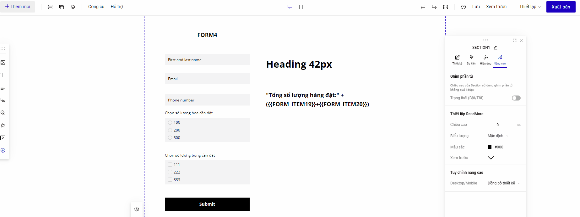 * Trường hợp bạn muốn cộng các giá trị số lại với nhau ví dụ form item 1 và form item 2 thì bạn thiết lập {{FORM\_ITEM1}}+{{FORM\_ITEM2}}