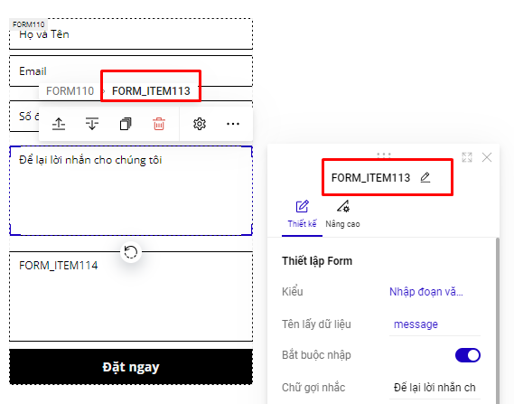 Lưu ý : các giá trị FORM\_ITEM1 bạn phải thay thế tương ứng với giá trị thực tế trên form của bạn . Cách lấy giá trị FORM\_ITEM bạn lấy như ảnh mẫu hướng dẫn&#x20;