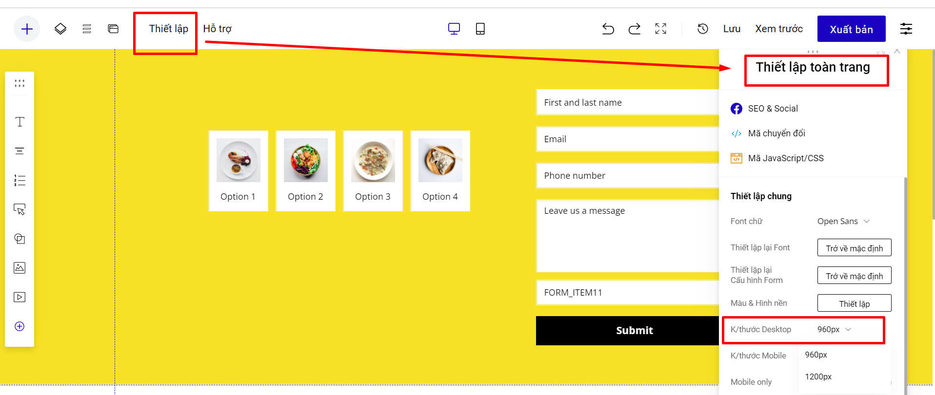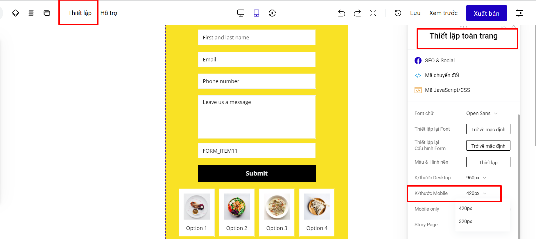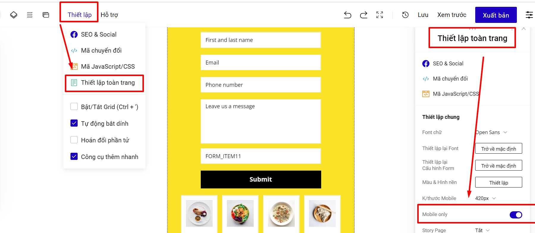 Khi bạn đang ở chế độ thiết kế Responsive, bạn có thể thay đổi để chuyển sang giao diện Mobile Only theo hướng dẫn: vào mục **Thiết lập** ở menu trên cùng và chọn **Thiết lập toàn trang**. Sau đó bật chế độ Mobile only.