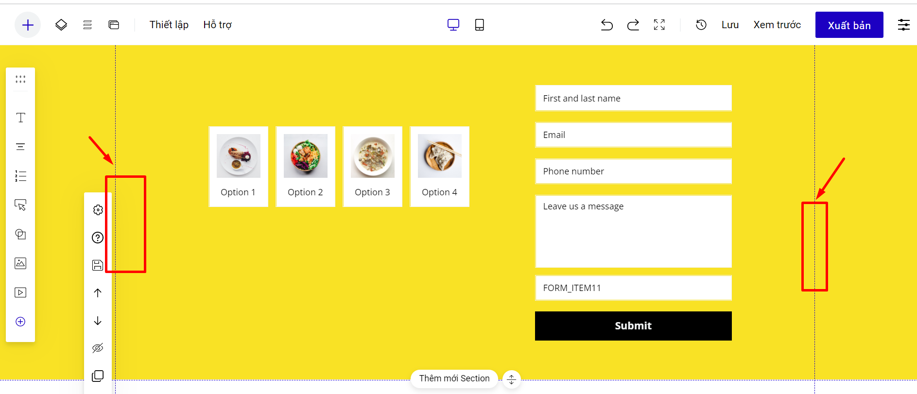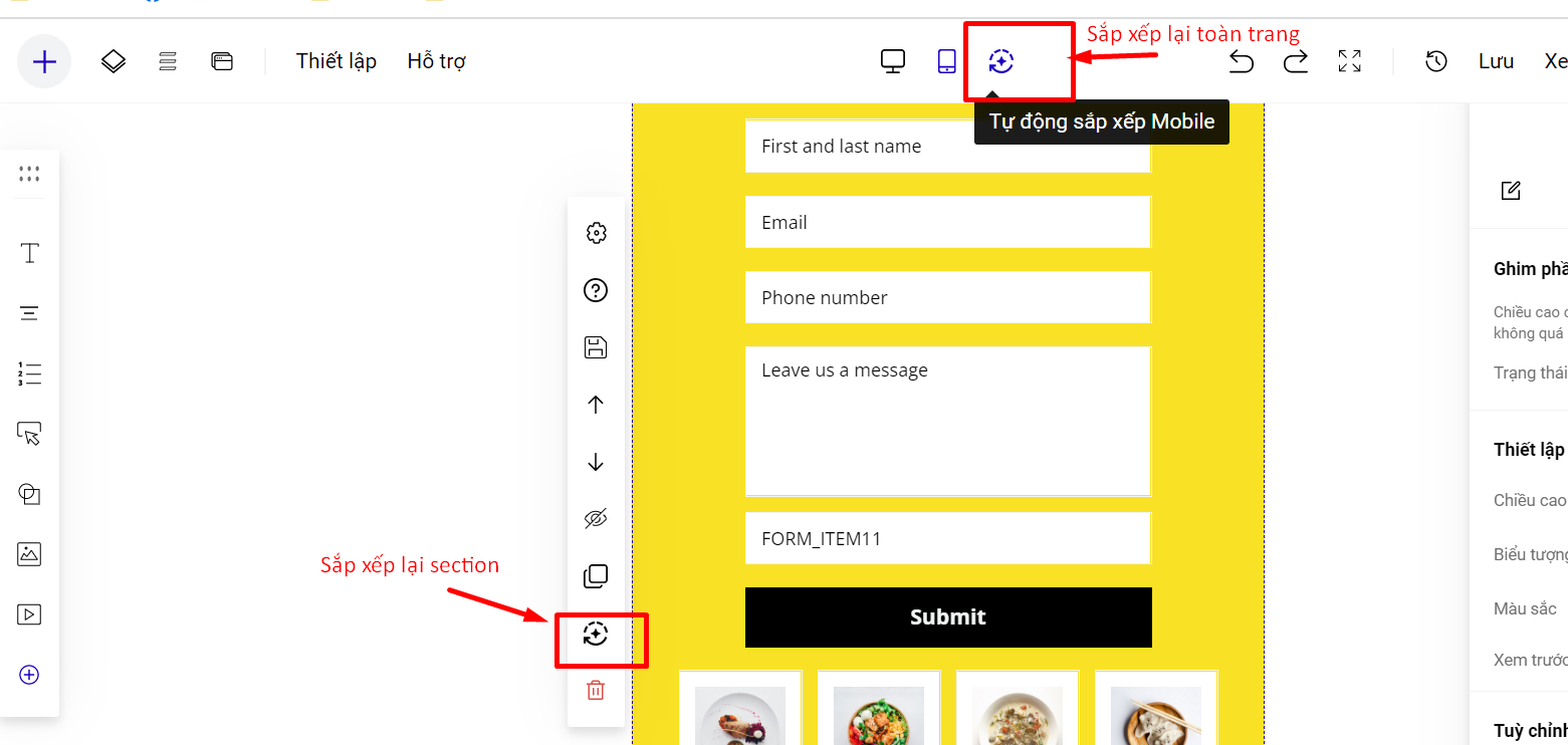 * Nếu sang thiết kế bản mobile bị lệch, bạn thực hiện kéo thủ công lại để việc hiển thị được đẹp nhất, hoặc chọn sắp xếp tự động toàn trang landing page hoặc sắp xếp tự động theo từng section.