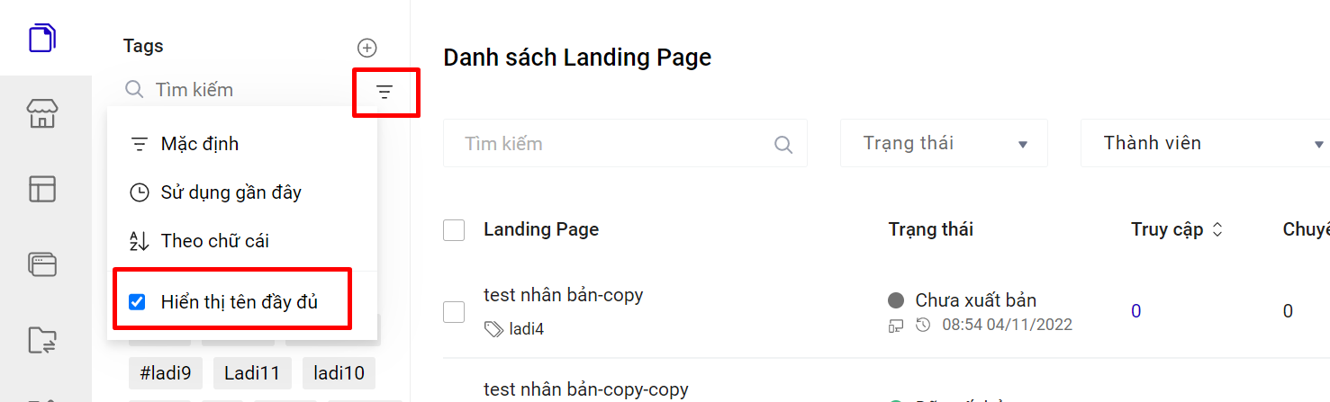 * **Sử dụng gần đây**: Chế độ này sẽ hiển thị theo tag bạn gắn cho landing page gần nhất hoặc tag được gắn cho landing page được xuất bản gần nhất.