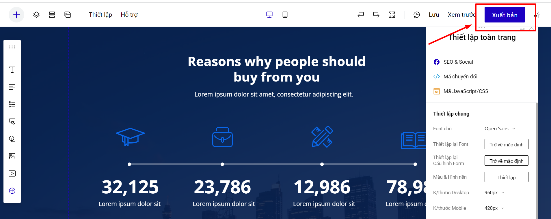 Các chỉnh sửa, cập nhật nội dung của bạn trên Landing Page cần phải được Xuất bản để hiển thị tới khách hàng bằng cách:
