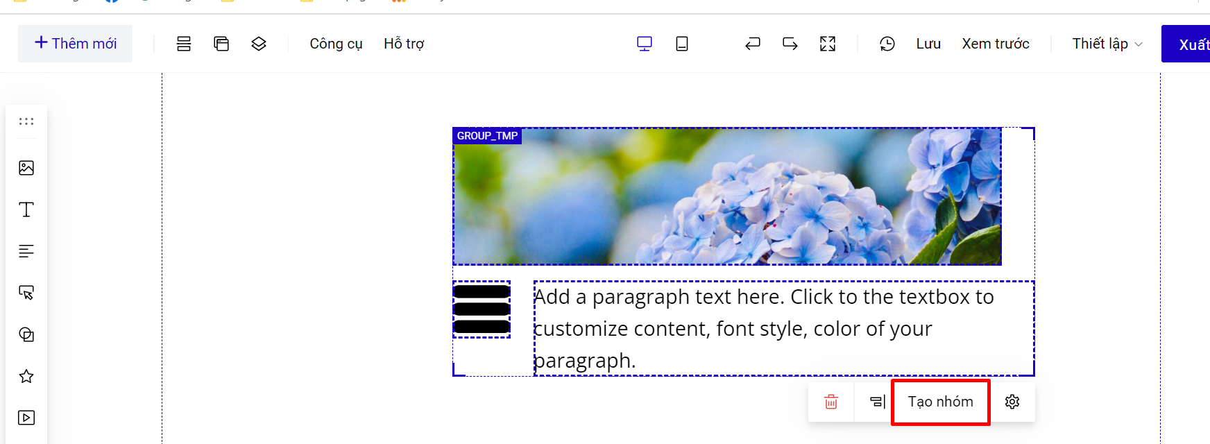 Tạo nhóm phần tử là thao tác giúp bạn nhóm các phần tử liên quan với nhau để dễ dàng di chuyển. Thao tác này cũng đồng thời giúp sắp xếp gọn gàng các phần tử này ở phiên bản mobile. Bạn quét chuột như thao tác bôi đen để tạo nhóm.