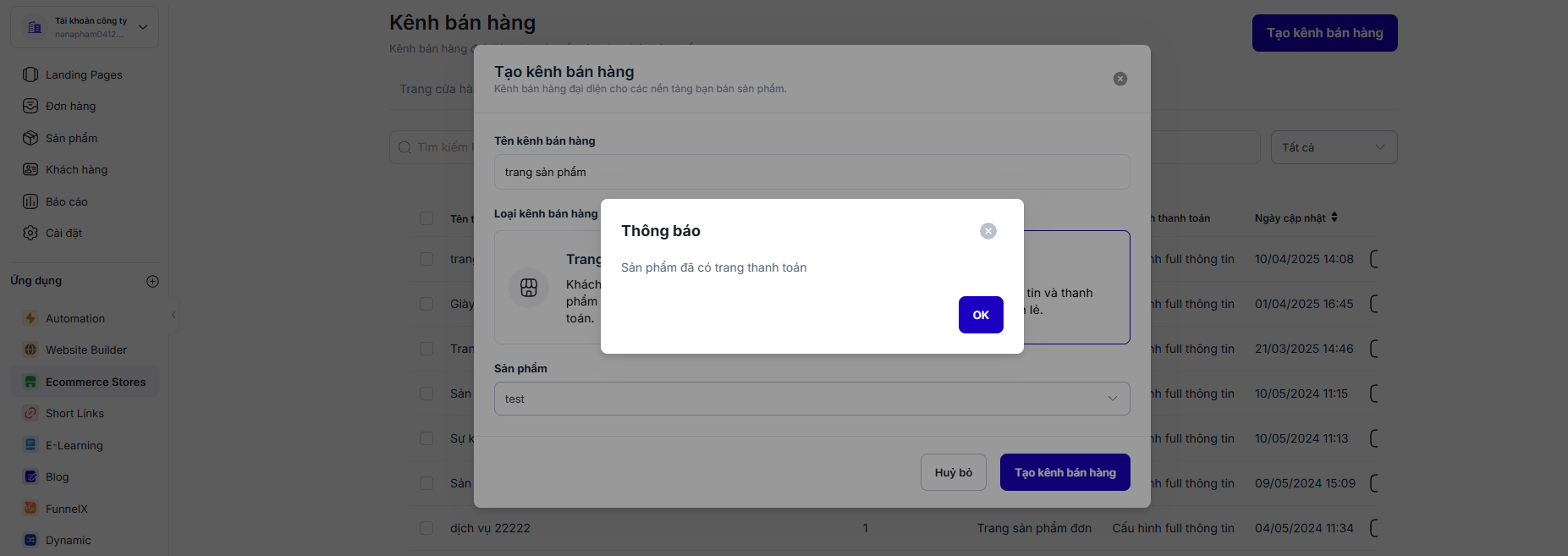 Trong trường hợp sản phẩm đã có trang thanh toán, khi bạn tạo mới 1 trang thanh toán vơi sản phẩm đó sẽ hiển thị thông báo lỗi, ví dụ