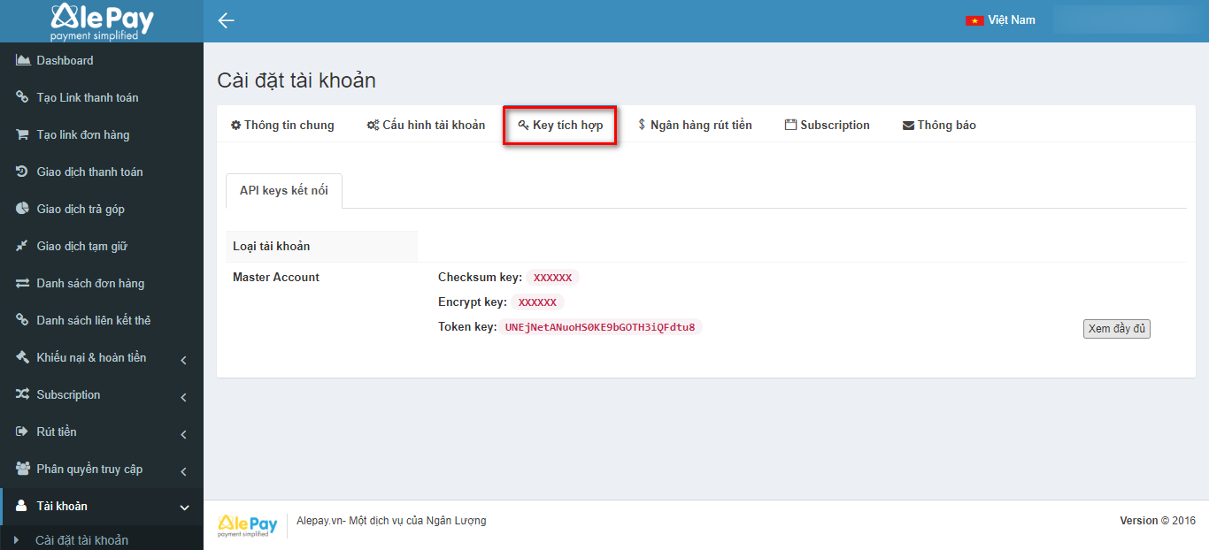 Bước 3: Lấy key AlePay