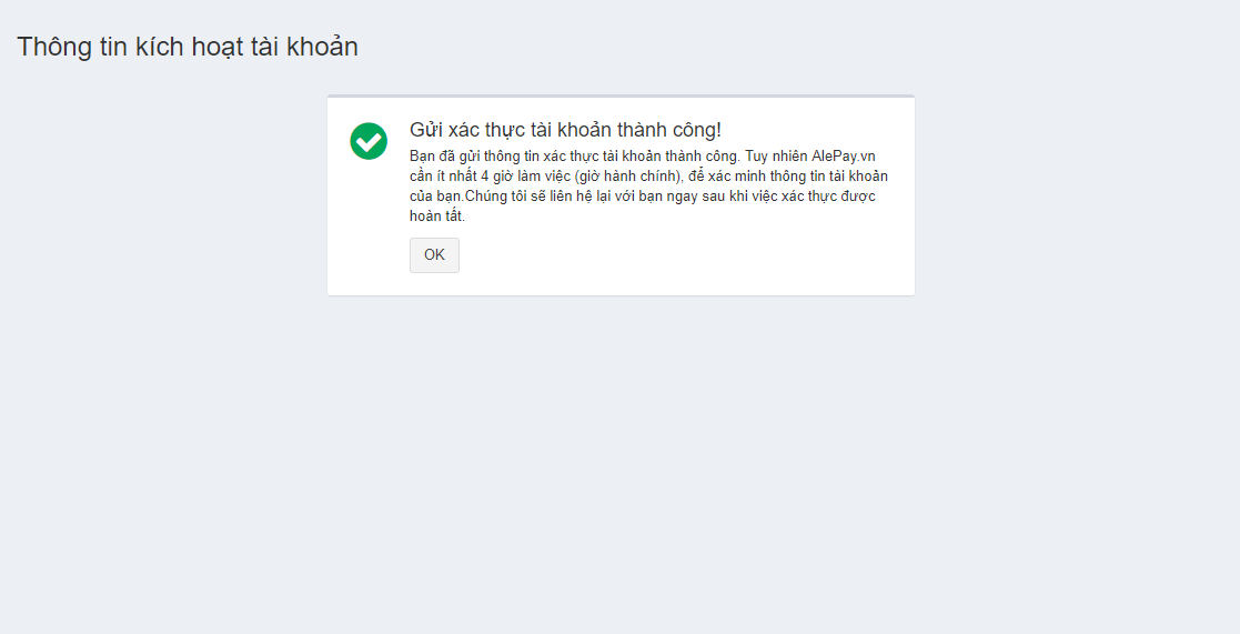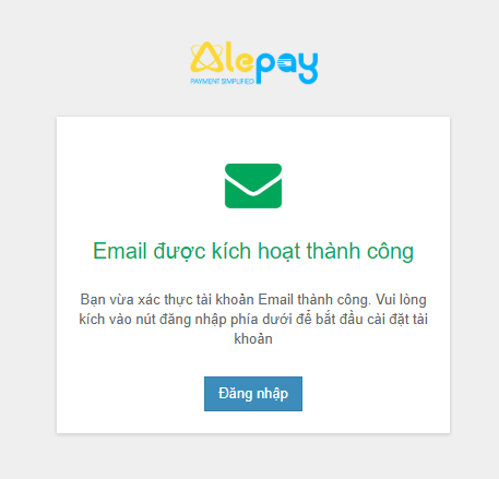 Khi bạn xác thực email thành công, AlePay hiện thông báo xác thực thành công.