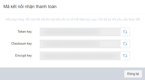 Mã kết nối nhận thanh toánhiện ra. Tại đây, bạn sao chép Token key, Encrypt Key, Checksum Key và qua bước 4 để tích hợp vào LadiSales.