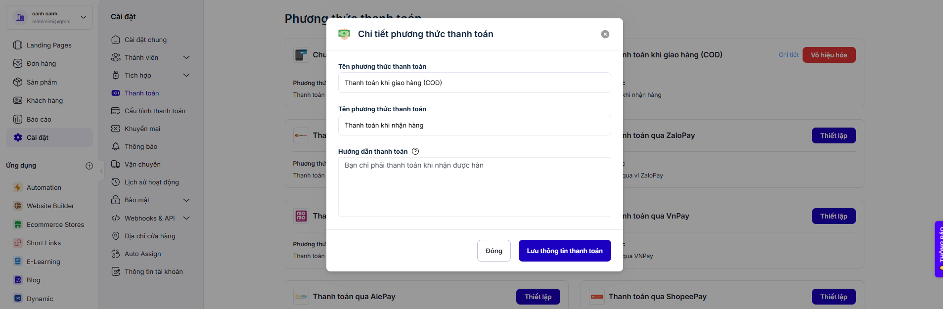 * **Bước 1:** Chọn Cài đặt ->Thanh toán, chọn COD