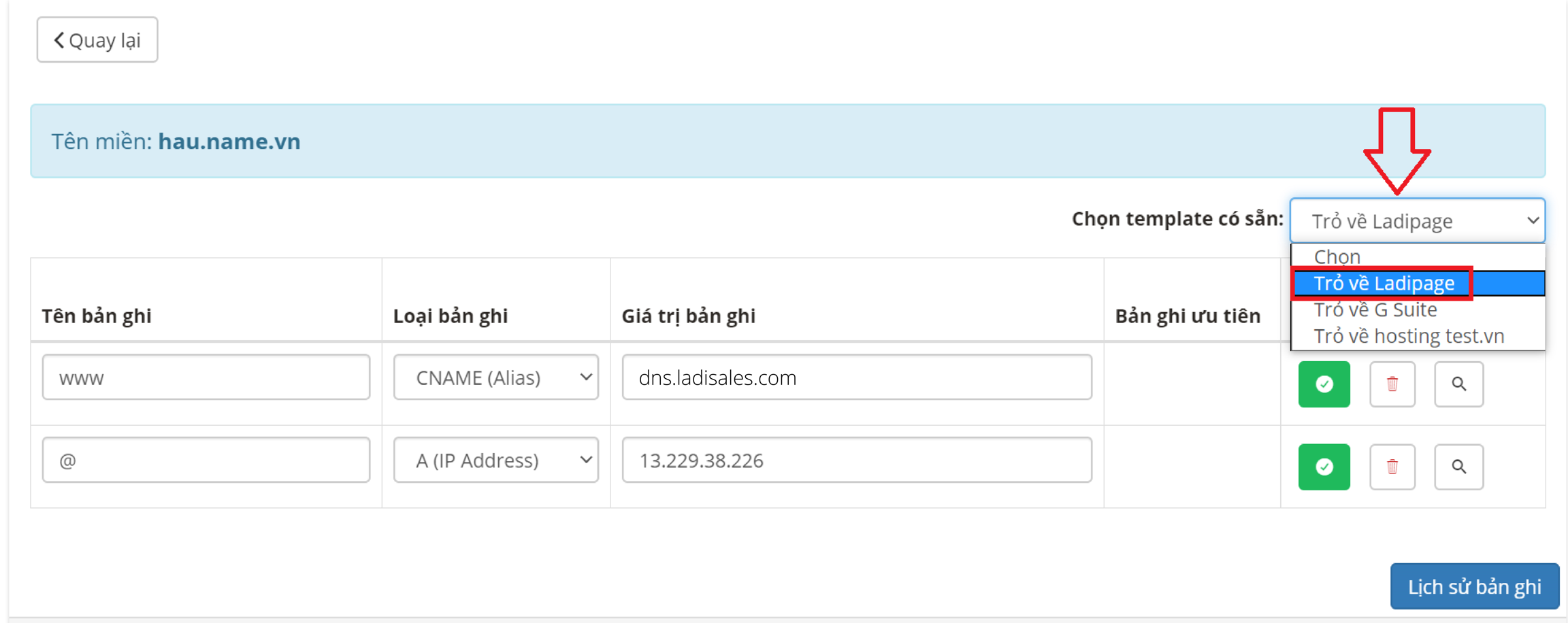 Tên bản ghi : www Loại bản ghi : CNAME Giá trị bản ghi : dns.ladisales.com