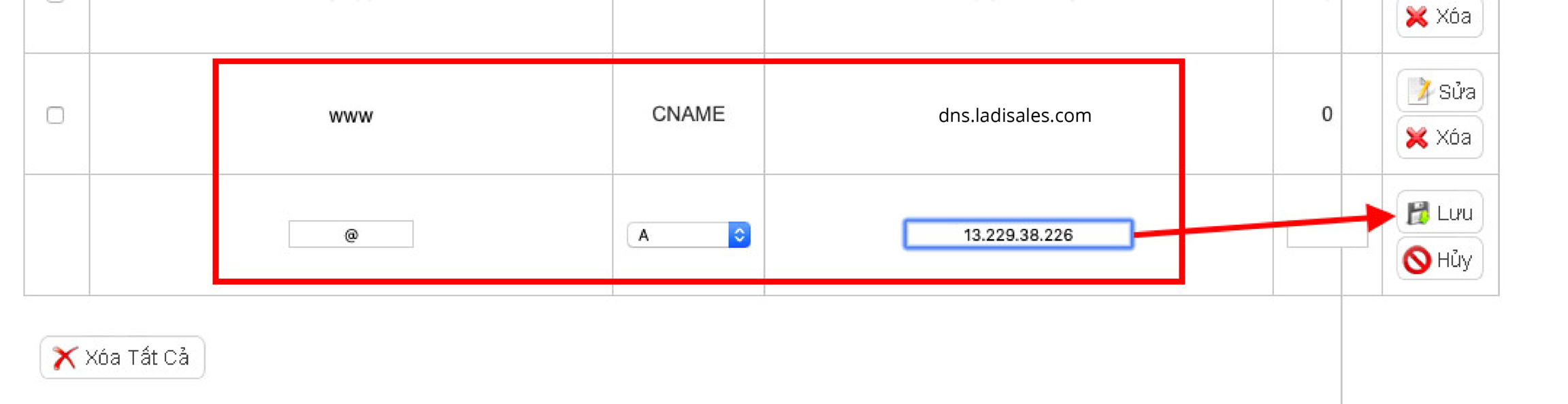 Host record: www Type (Loại): CNAME Value (Giá trị): dns.ladisales.com