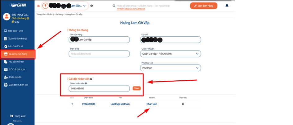 Lưu ý : Bạn cần cấp quyền cho LadiPage Việt Nam trong tài khoản của GHN để có thể gửi đơn từ LadiSales sang GHN, thao tác như sau : Truy cập tài khoản của GHN > Quản lý cửa hàng > Nhân viên , nhập tên nhân viên là số điện thoại : 0982489833 , xác thực cho quyền Nhân viên