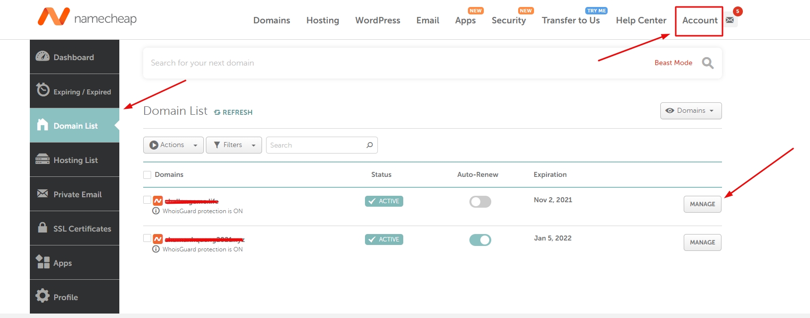 - Truy cập tài khoản của bạn ở https://ap.www.namecheap.com/