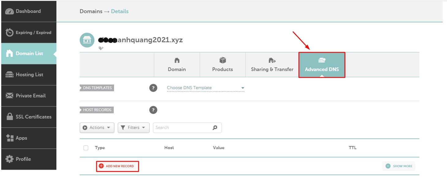 - Chọn mục Advanced DNS, sau đó chọn Add New Record để thao tác tạo bản ghi tên miền.