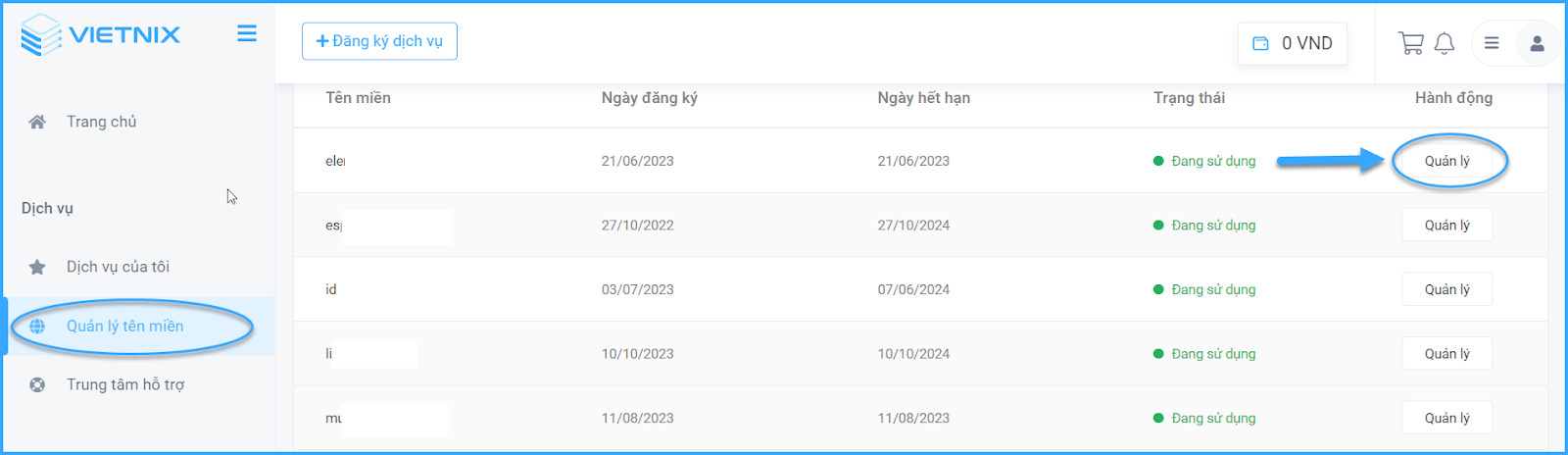 **Bước 2:** Tại trang quản trị dịch vụ bạn chọn mục **Quản lý tên miền** sau đó chọn tên miền cần trỏ và chọn **Quản lý.**