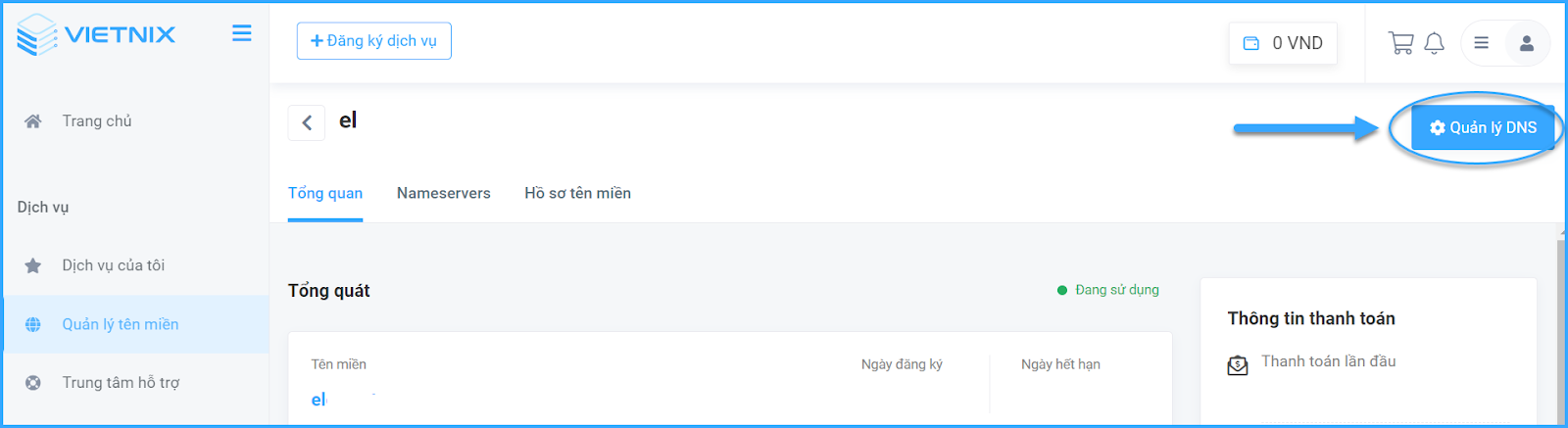 Sau đó chọn **Quản lý DNS** để cập nhật hoặc thêm bản ghi