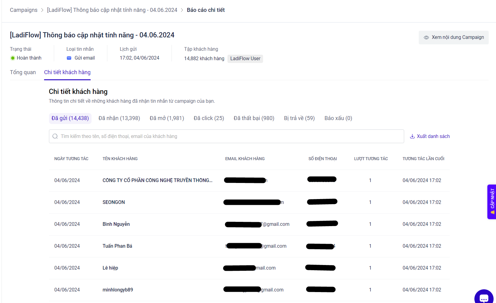 Chọn **Chi tiết khách hàng** để xem báo cáo chi tiết chỉ số tương tác của từng khách hàng: lượt mở, lượt click và trạng thái.<br>