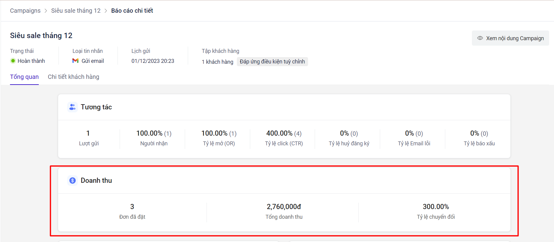 * Tỷ lệ chuyển đổi:  số đơn hàng/số người nhận tin