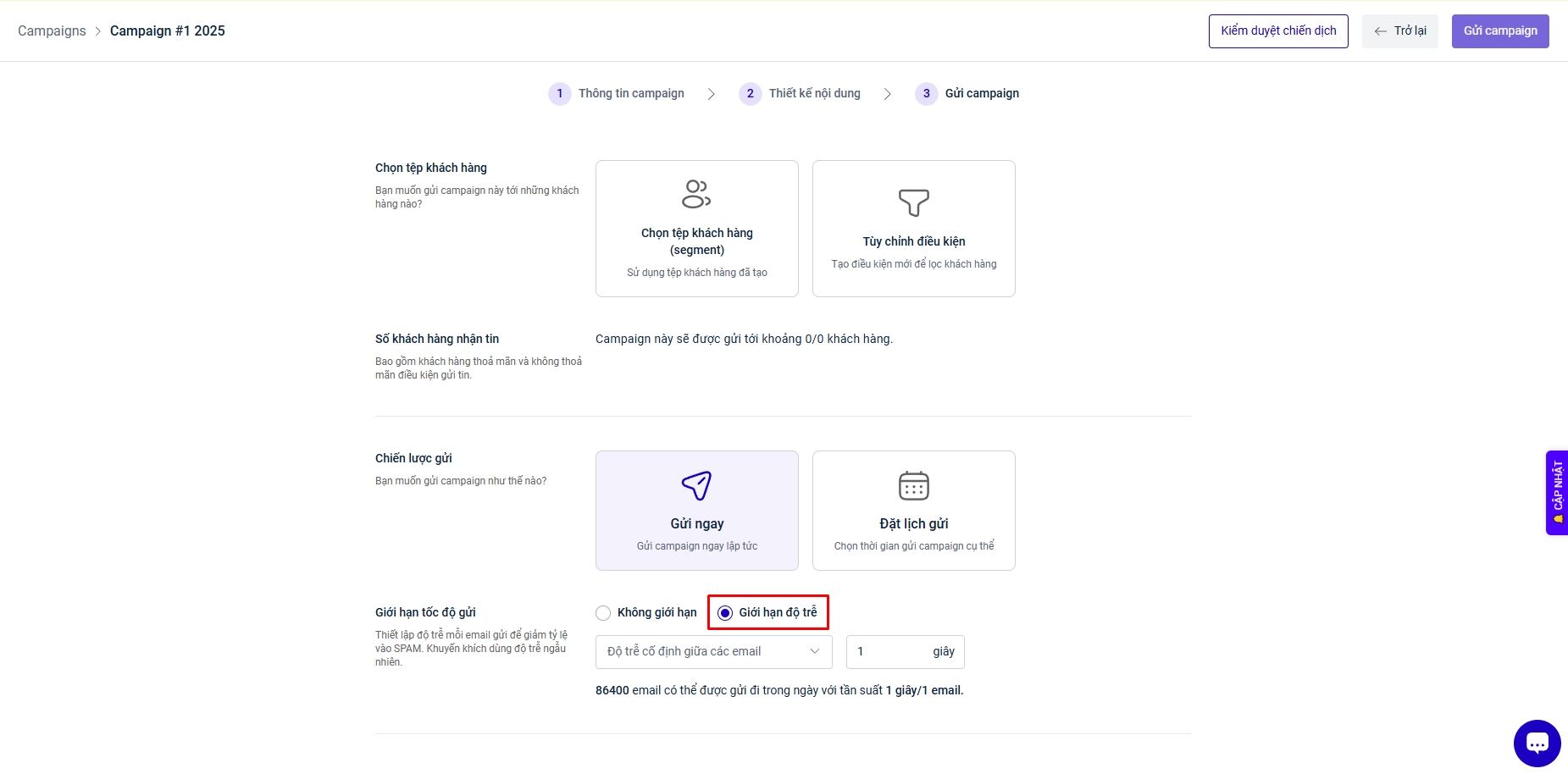 - Tại Bước 3 (Gửi campaign): Ở mục Giới hạn tốc độ gửi, Chọn Giới hạn độ trễ.