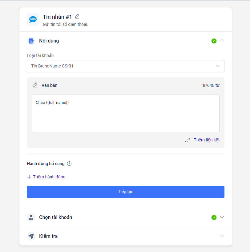 6. **Mở mục Chọn tài khoản, chọn tài khoản tích hợp gửi tin SMS**. Nếu bạn chưa có, hãy tích hợp thêm.