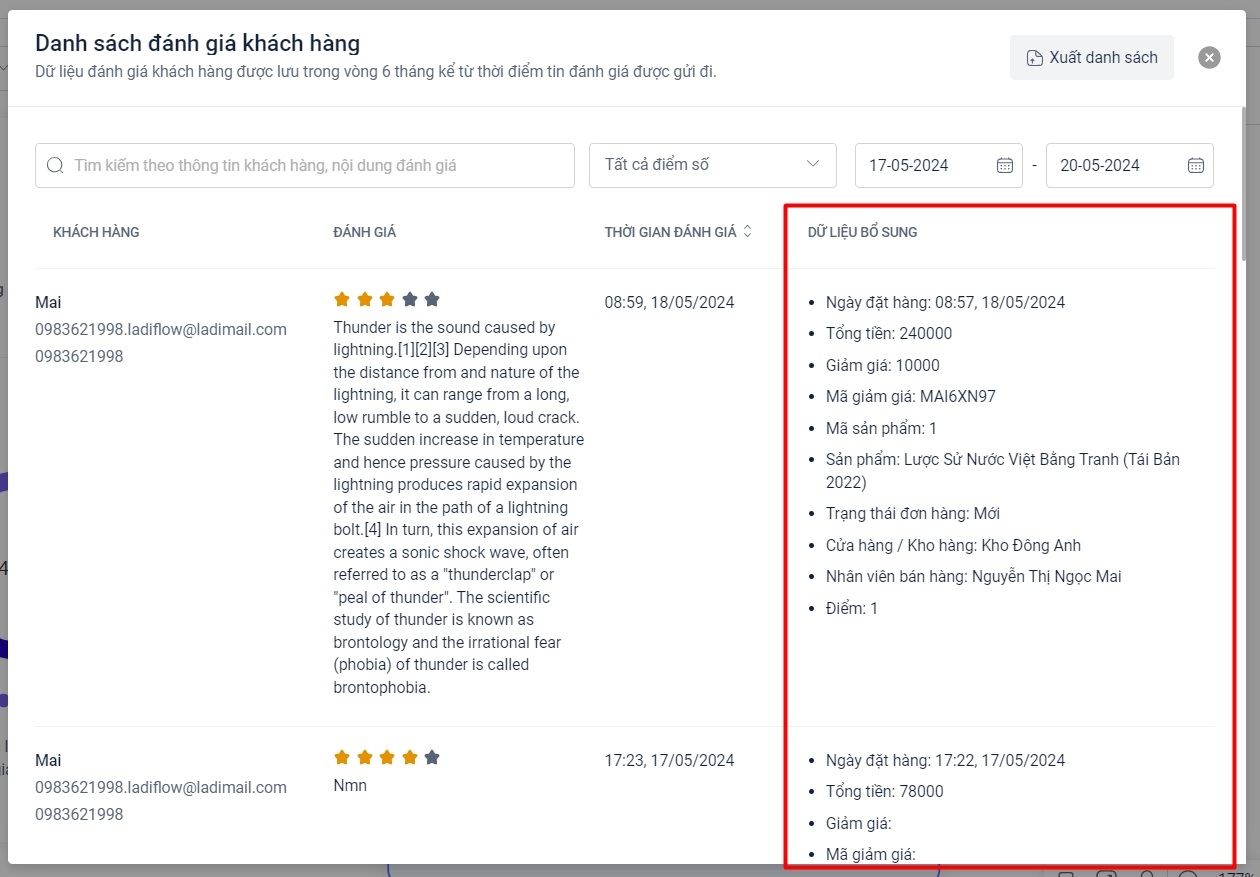 - Nếu mẫu tin bạn chọn là mẫu tin đánh giá dịch vụ, bạn có thể tùy chỉnh dữ liệu báo cáo bằng cách chọn Thêm dữ liệu báo cáo bổ sung