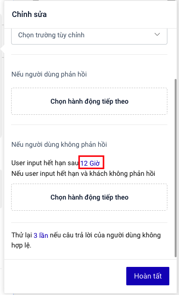 6. Chọn thời gian hết hạn của User Input. Nếu sau khoảng thời gian này mà khách hàng chưa trả lời, User input sẽ hết hiệu lực. <br>