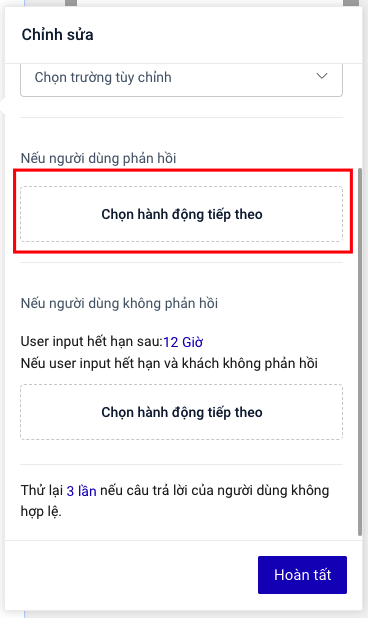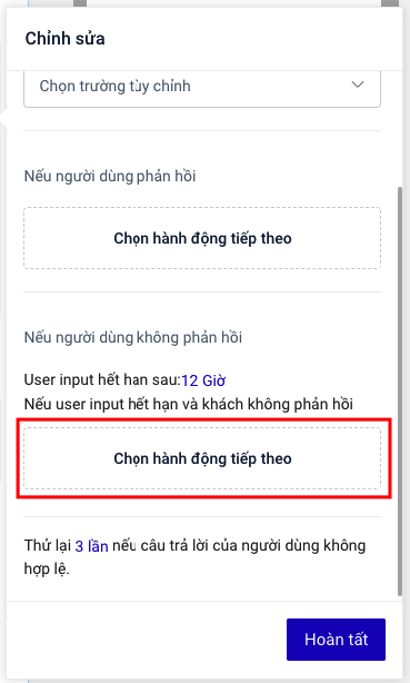 7. Chọn hành động nếu User input hết hạn và khách hàng không phản hồi. Hành động sẽ được thực hiện nếu quá thời gian hiệu lực của User input và trong suốt khoảng thời gian hiệu lực của User input khách hàng không phản hồi.<br>
