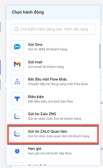 Tìm và chọn thêm hành động Gửi Tin Zalo quan tâm.