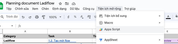 Chọn Tiện ích mở rộng, sau đó chọn Apps Script.