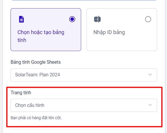- Chọn Sheet lấy dữ liệu. Đây là Trang tính mọi sự thay đổi dữ liệu trên ô tính, hệ thống sẽ thực hiện cập nhật dữ liệu khách hàng tại hàng có ô tính thay đổi dữ liệu.