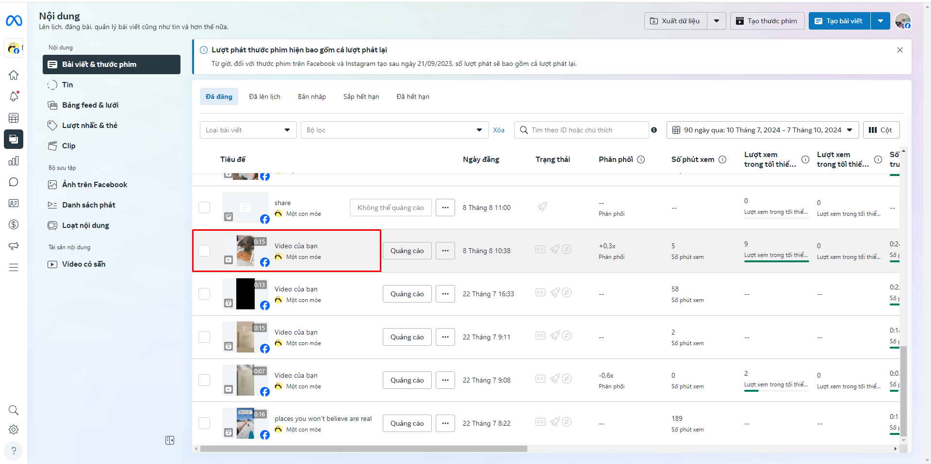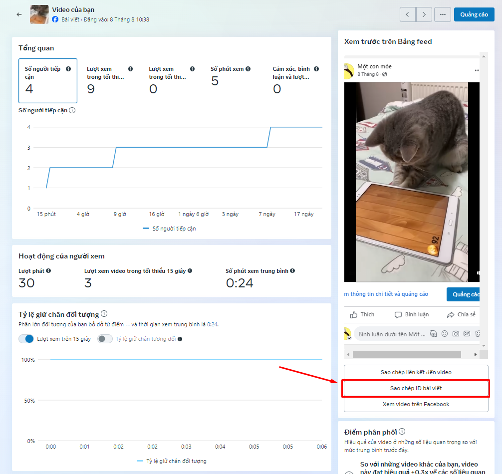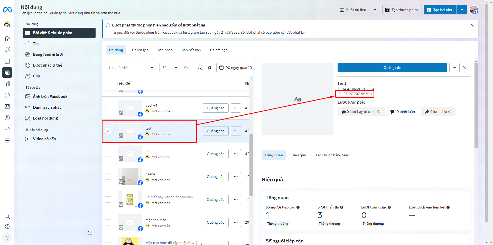 **Với những bài đăng dạng Thước phim:**  Tại danh sách Bài viết & Thước phim, bấm vào thước phim mà bạn muốn -> Chuyển hướng đến trang chi tiết -> Nhấn vào nút Sao chép ID bài viết.