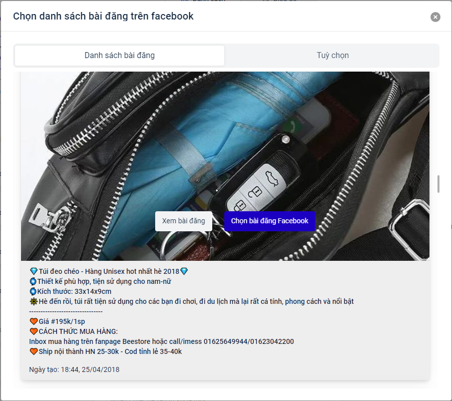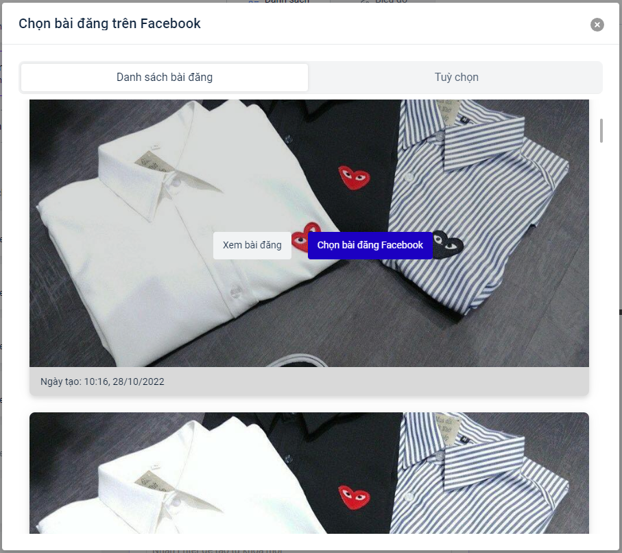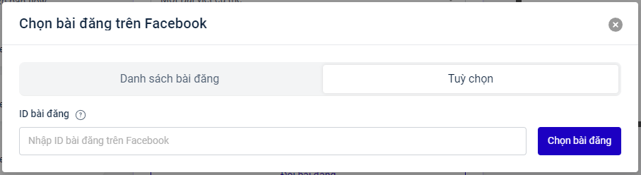 * Chọn bài đăng trên Trang Facebook: **Chọn bài đăng từ tab** "**Danh sách bài đăng"** hoặc bằng cách **nhập** **ID bài đăng trong tab "Tùy chọn"**.
