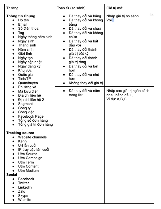 Dưới đây là danh sách các trường mặc định và điều kiện so sánh: