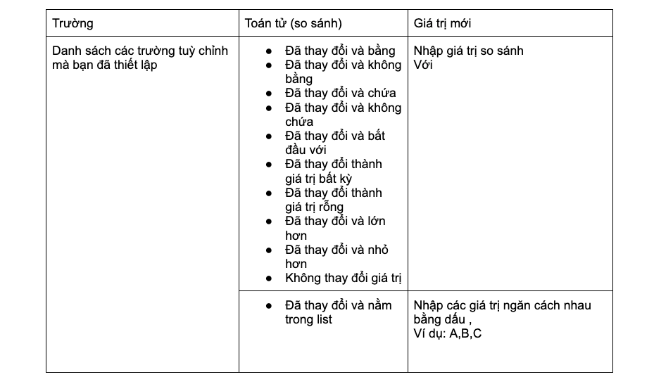 Trigger hoạt động khi trường thông tin tuỳ chỉnh của khách hàng thay đổi theo điều kiện thiết lập.