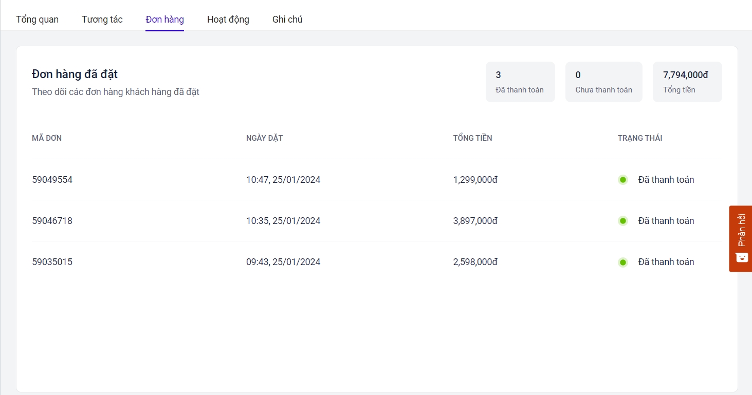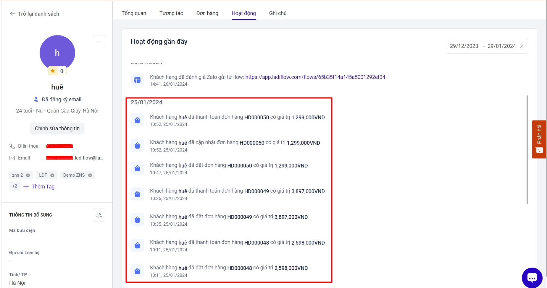 Bạn có thể xem lịch sử hoạt động mua hàng của từng khách hàng.