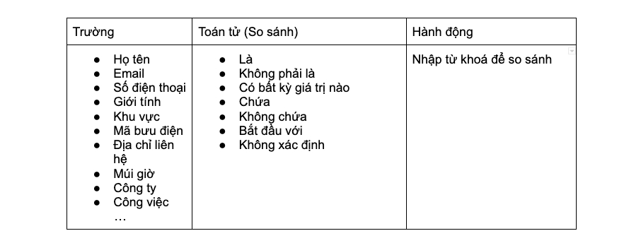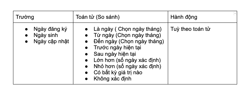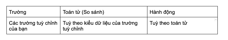 Tuỳ theo kiểu dữ liệu tại trường đó, hệ thống sẽ hiển thị các toán tử cho phép tương ứng. Bạn cần điền giá trị so sánh cho từng điều kiện.