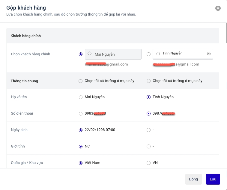 - Chọn các thông tin muốn giữ khi gộp 2 khách hàng.